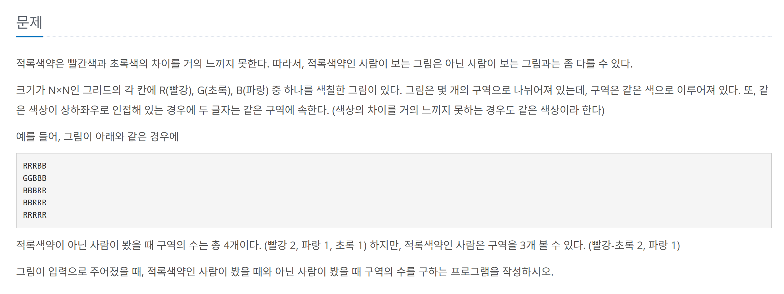 색약일 때는 R과 G를 한 색으로 생각하고 영역을 세도록 bfs를 하면 이 문제는 해결된다.